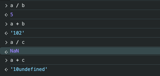 Infinity: 양의 무한대-Infinity: 음의 무한대NaN: 산술 연산 불가(not-a-number)- ⚠️